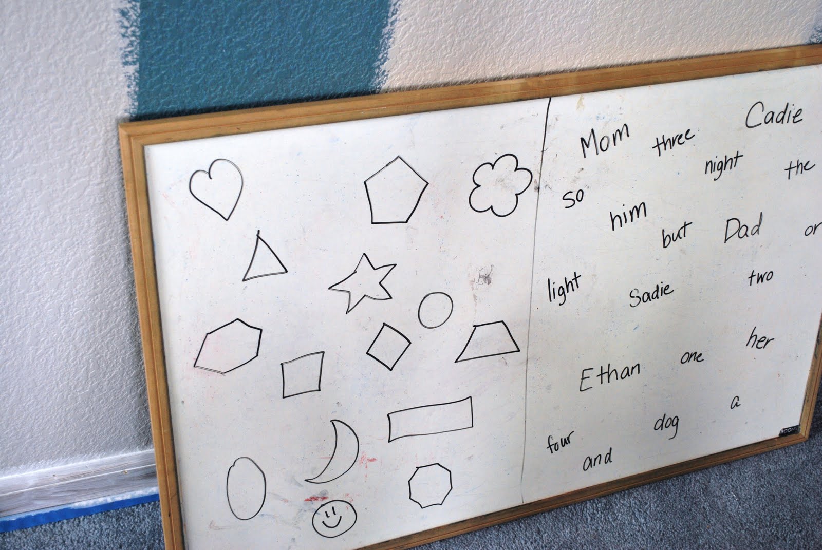 I divided the board in half to have shapes on one side (for my 2 YO) and sight words on the other side (for my 4 YO).